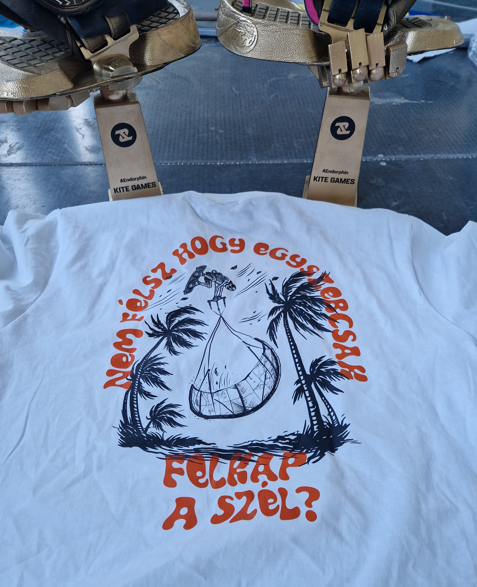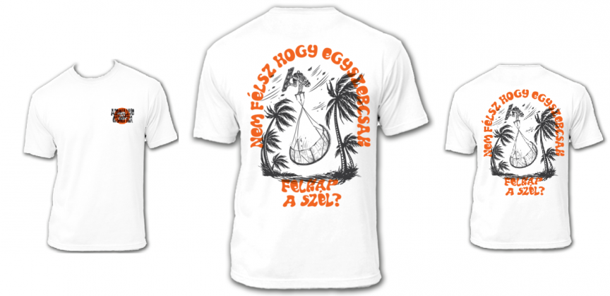 Amelyre standard válaszunk sokáig az volt, hogy „Mi örülnénk a legjobban.” De aztán Deák Tomi áprilisában átélt egy hihetetlen termik elszakadást a Velencei tavon, amely következtében több mint 760 métert repült. Azóta már egy kicsit félünk, hogy felkap a szél; azonban a pólóra kerülő dizájn nagy sikert aratott. Ajánljuk minden szél fanatikusnak!