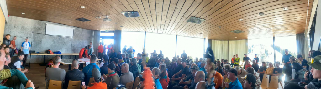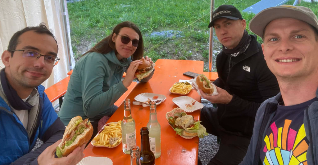 Tetszik a szervezők fenntartható hozzáállása nagyon, ami több szempontból is megmutatkozik. Eleve elintézték, hogy lehessen a bezaui felvonó parkolójában lakóautózni fillérekért, ami nagy királyság, mivel Ausztriában tilos az ilyesmi. A négy napos verseny nevezési díja csak 160+25 eur volt, amiből a 25 csak akkor kell kifizetni, ha nincs saját trackered (nekünk nincs, de már lassan vehettem volna egyet a sok bérlés árán), ami magába foglalja a felvonót, a napközbeni kajacsomagot és a visszaszállítást is, bár ezúttal ismét egy érdekesség állt elő: tömegközlekedéssel történik egyénileg a visszaszállítás, amihez kaptunk egy 4 napos elektronikus jegyet. Továbbá a HQ-nál a nap végén közös kajálást is szerveztek nagyon kedvező áron, feldobva a jamboree hangulatot. Ja és egy 10 eurós beváltható kupont is kaptunk, amiből kijön egy vacsi sörrel, ráadásul mindenki magának rakhatja össze a hambit is, így sikerült a képen is látható “herkentyűburger” 😃 de kaptam még utána grillezett ananászkarikát sült hússal is ajándékba. A helyszín csodálatos, a felvonó fenti állomása is meseszép, a kilátás pazar. Ott tartják az eligazításokat és egy kis sétával elérhető a starthely, ami picit trükkös, mert egy fekete sípálya teteje, bokáig érő hóval – legalábbis az északi irányra, a déli oldalakon már nagyjából elolvadt a hó.