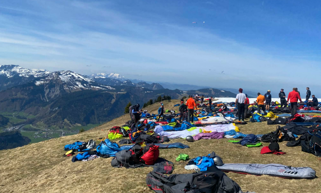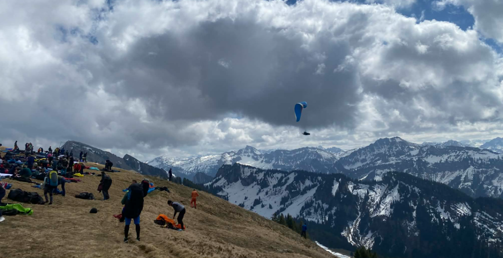 Na és akkor a starthely: délig a termikek dominálnak délről, de aztán elindul az északias áramlás a Bodensee-lapály felől, így mindenki a sípályára kezdett teríteni a 14:00-ás rajthoz. Viszonylag későn startoltam, mivel azt láttam, hogy mindenhol küzdenek, nem egyértelmű a kiemelkedés, így csak 30 percem maradt pozícióba kerülni, ami viszonylag kevés, 40-50 p ideális, de van aki 1-1,5 h-val korábban is levegőbe kerül, ha a helyzet engedi. Eleinte nekem nagyon fárasztó volt 120 pilótát huzamosabb ideig kerülgetni a startcilinderben, de gyakorlattal javul a helyzet.