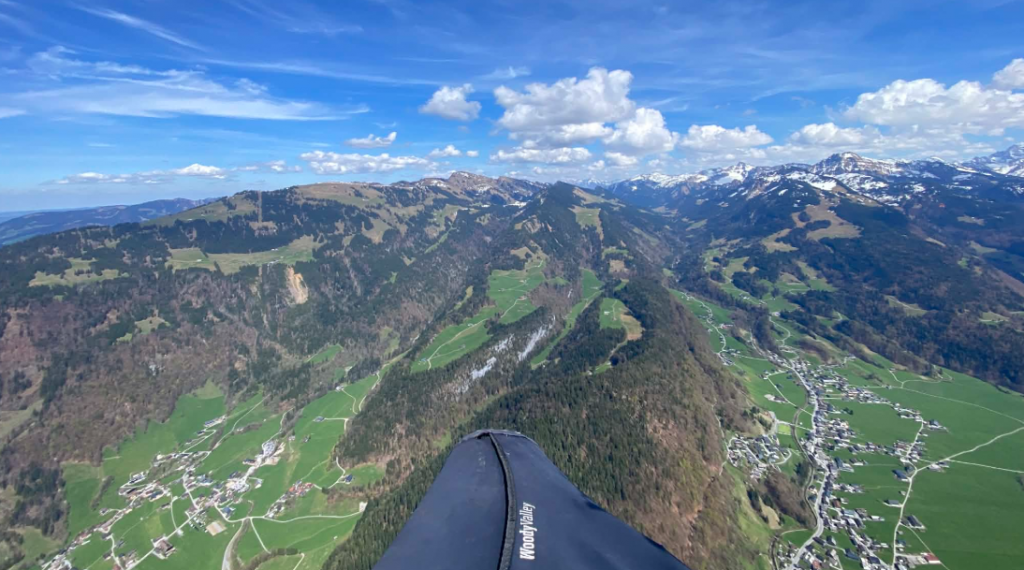 Ezúttal csak süllyedtem az északi oldalon, így körberepültem a felvonó fenti állomását és bevetettem magam a fák között a lee oldalba, ami eleinte kellően megcibált, de aztán szépen tekerhető termiket találtunk és gyorsan a gerinc magassága fölé kerültünk, ami után simává vált a levegő is. Egy óra volt a rajtig, így bőven volt idő nézelődni és keresni a megfelelő pozíciót, így pótoltam a tegnapi vizuális lemaradást a környékről – már megérte eljönni!