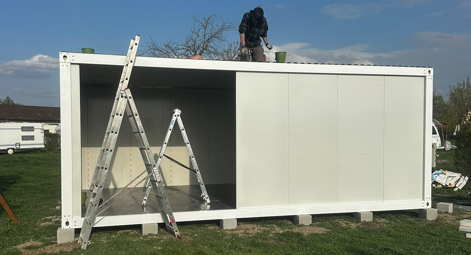 A két új konténer már megérkezett, az ablakaik is kivágásra kerültek. Az egyik egy home office helyiség lesz (ez a fejlesztés a SurfCamping saját beruházása volt). A másik azonban a TrueSurfers School and Shop, amellyel Harmati Dani új szintre emelheti az oktatást a spoton.