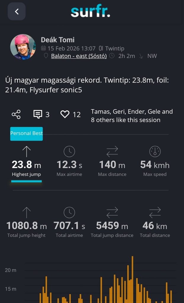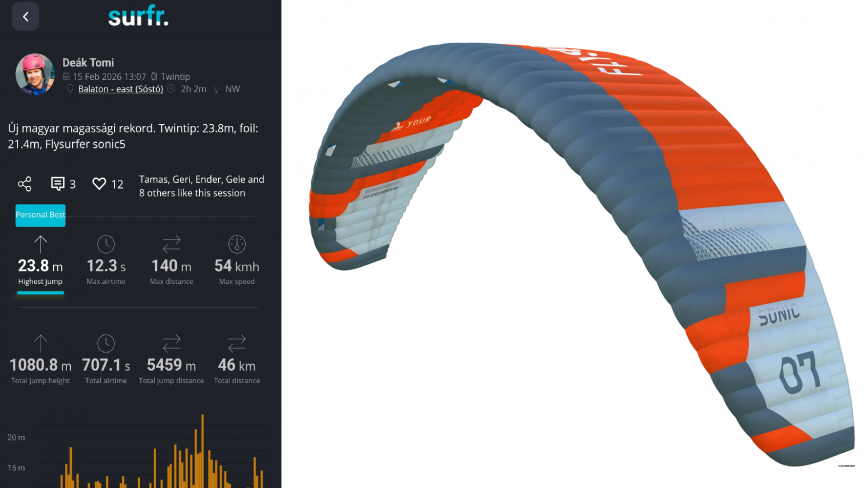 Deák Tomi: A session elején még gyengébb volt a szél, röviden megszoktam az új ernyőt twintip deszkával, majd foilra váltottam, amivel sikerült a hazai foil rekordot és az abszolút rekordot is megdöntenem. 21,4 méter magasat sikerült ugranom. Amikor a szél igazán beerősödött, akkor a hidegben már nem esett jól foilozni, mert ott többet hibázam, így gyorsabban áthültem, így visszaváltottam twintip-re. Volt egy kis szerencsém, mert pont beerősödött a szél, de az ernyő még nem a maximumán teljesített, van még benne kb. 10 km/h-val erősebb szél is.